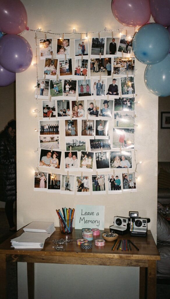 You can also hang fairy lights and clip photos onto them for a soft glow. Leave blank cards nearby so guests can write their favorite memory with you and pin it up.