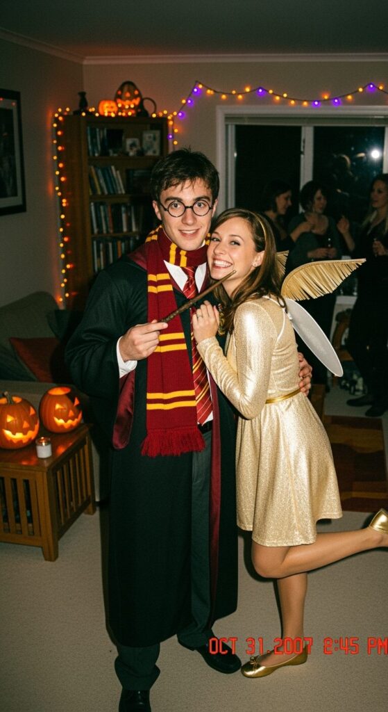 One of you gets to be Harry, which everyone knows, while the other sparkles as the Golden Snitch. It’s creative and it screams Halloween without being predictable.