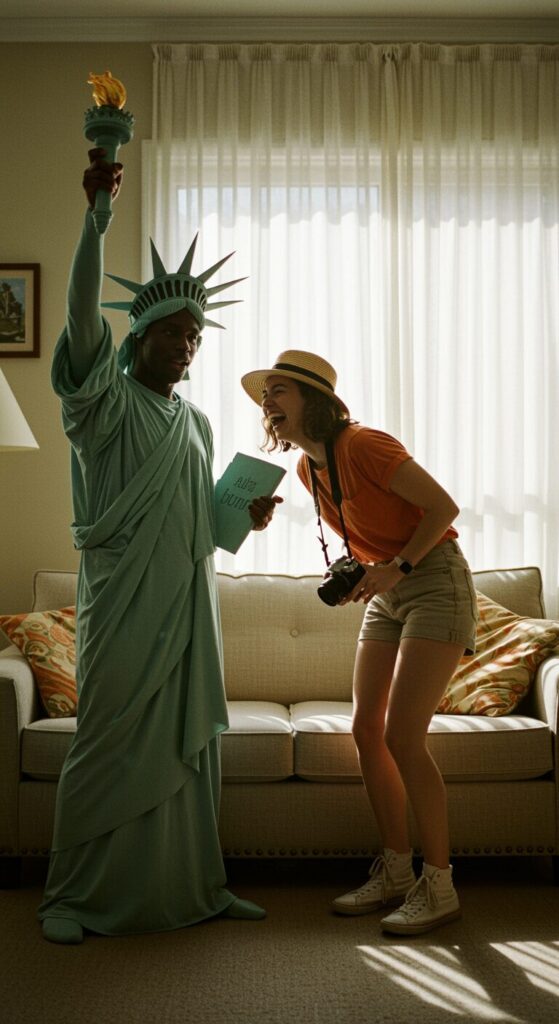 One of you gets to dress all glam as Lady Liberty while the other keeps it casual as a tourist. I love how it feels creative without being over the top.