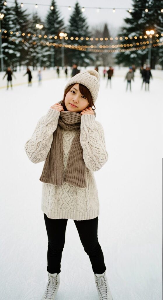 When I wear a chunky cream sweater with black leggings, I instantly feel put together without trying. Add a soft scarf and a beanie and suddenly you look like that girl on the ice.