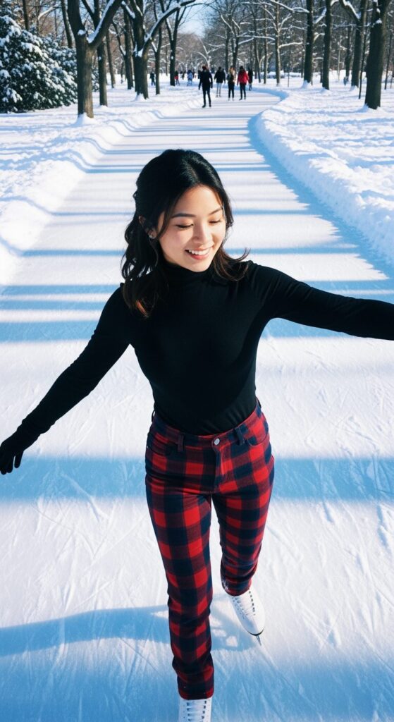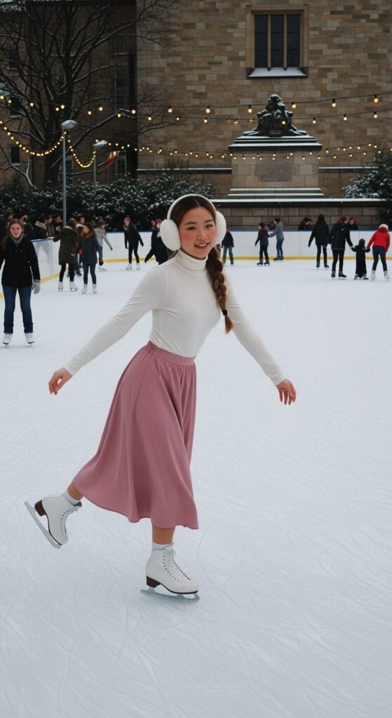 I love how a flowy midi skirt moves when you skate. It feels soft, pretty, and super feminine. I always pair it with a fitted turtleneck because it balances the look perfectly.
