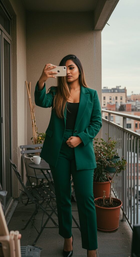 I personally love navy, black, or deep green for interviews because they are strong but not intimidating. Pair with a structured tote and subtle accessories.
