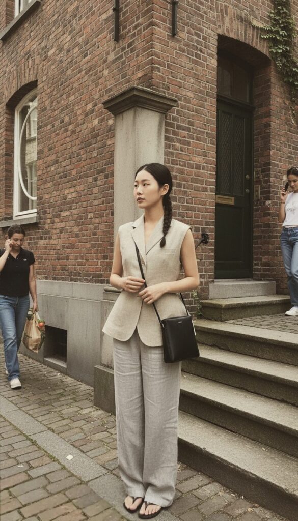 Linen trousers add that little touch of effortlessness that makes the whole outfit feel calm and confident.