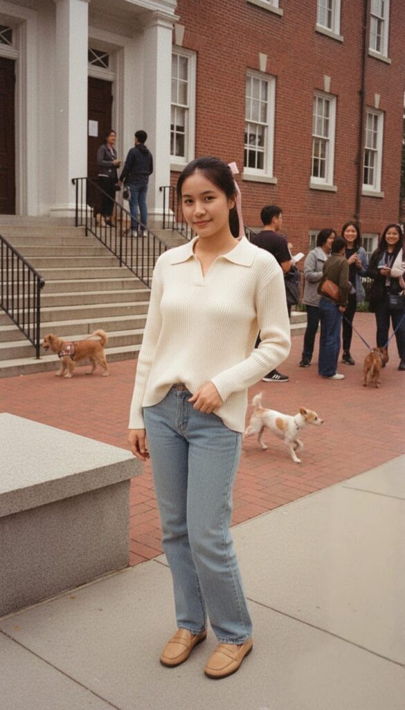 A collared jumper feels polished but still soft and the jeans keep the outfit grounded.