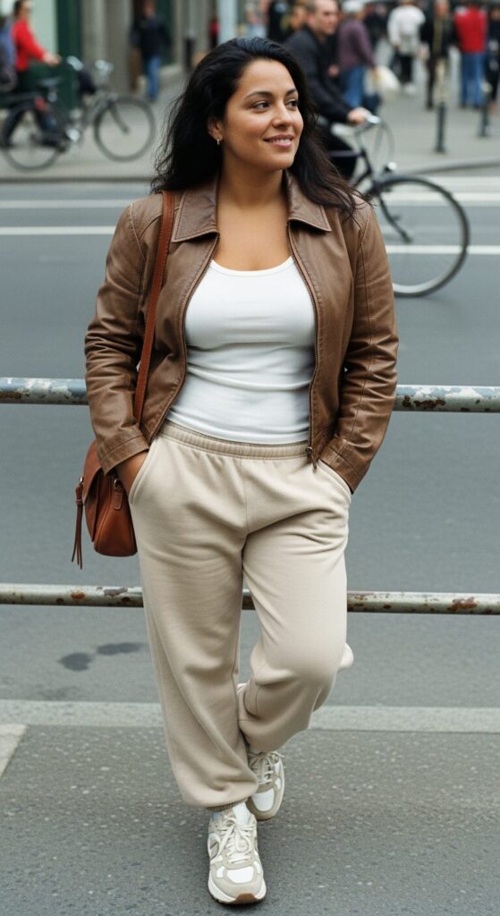 A brown leather jacket over a tank top with relaxed sweatpants is my easy go-to for casual days.