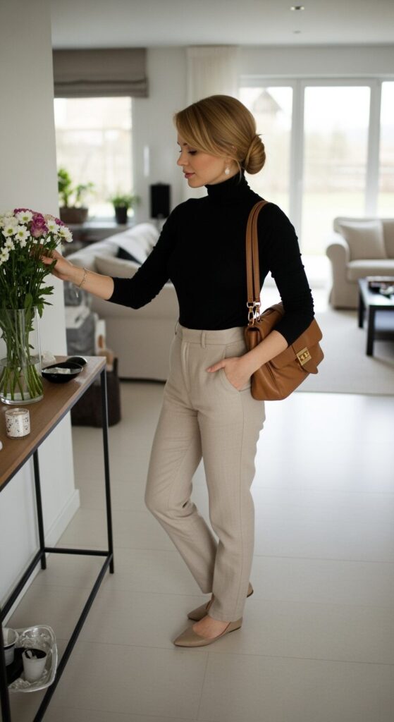 For cooler days, I love pairing a fitted turtleneck tucked into slim linen pants — it’s the perfect balance between cozy warmth and breathable comfort.