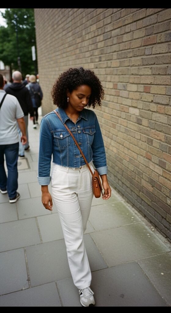 A cropped denim jacket brings a youthful, casual energy to the natural elegance of linen pants.