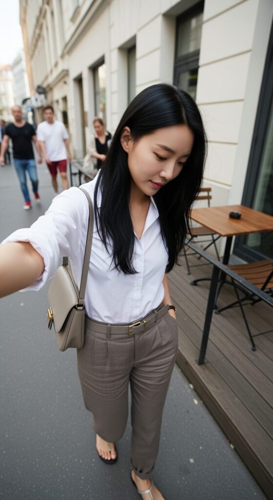 This outfit is a stylish way to play with proportions — the loose culottes balance the slightly structured shirt, making it perfect for creative workspaces or weekend brunches.