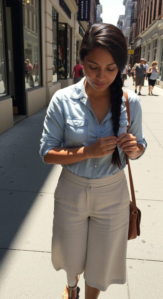 The soft denim feel of a chambray shirt adds casual texture against the relaxed, airy linen culottes.