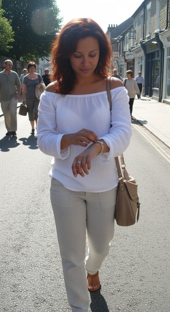 An off-shoulder top paired with linen pants is a breezy, flirty look perfect for summer days.
