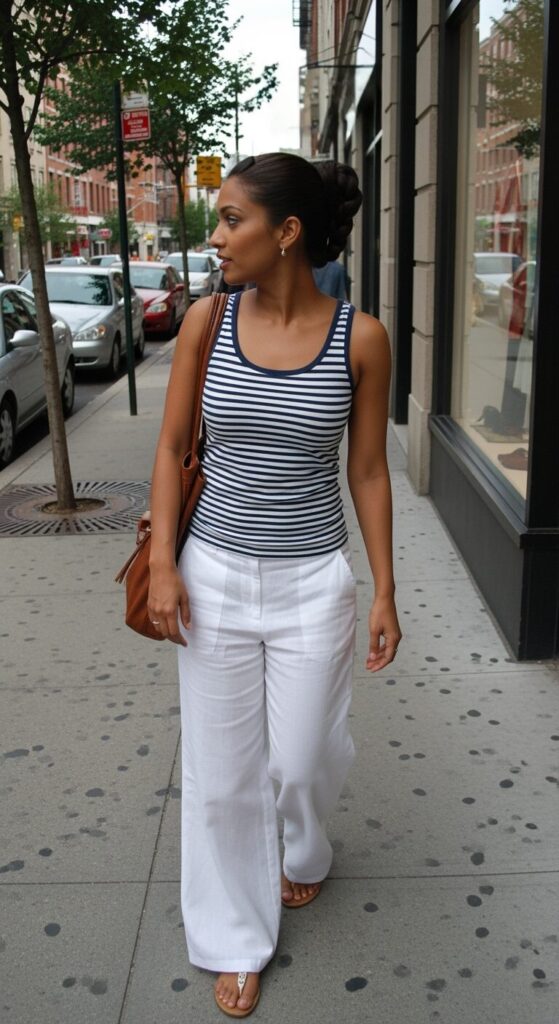 The casual vibe of a striped tank goes perfectly with the breezy flow of wide-leg linen pants. This outfit feels like those easy summer days — light, airy, and totally cool.