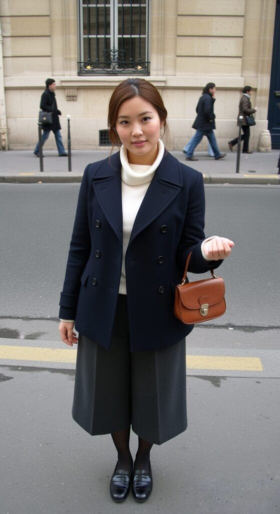I love how the peacoat gives that vintage luxury vibe while the white turtleneck keeps everything clean and fresh.