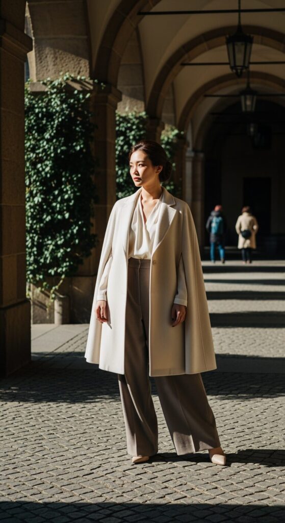 Cashmere Cape Coat + Silk Blouse + Tailored Wide-Leg Pants