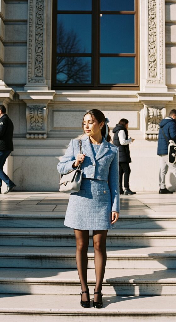Tweed Skirt Suit Set + Sheer Tights + Mary Jane Heels