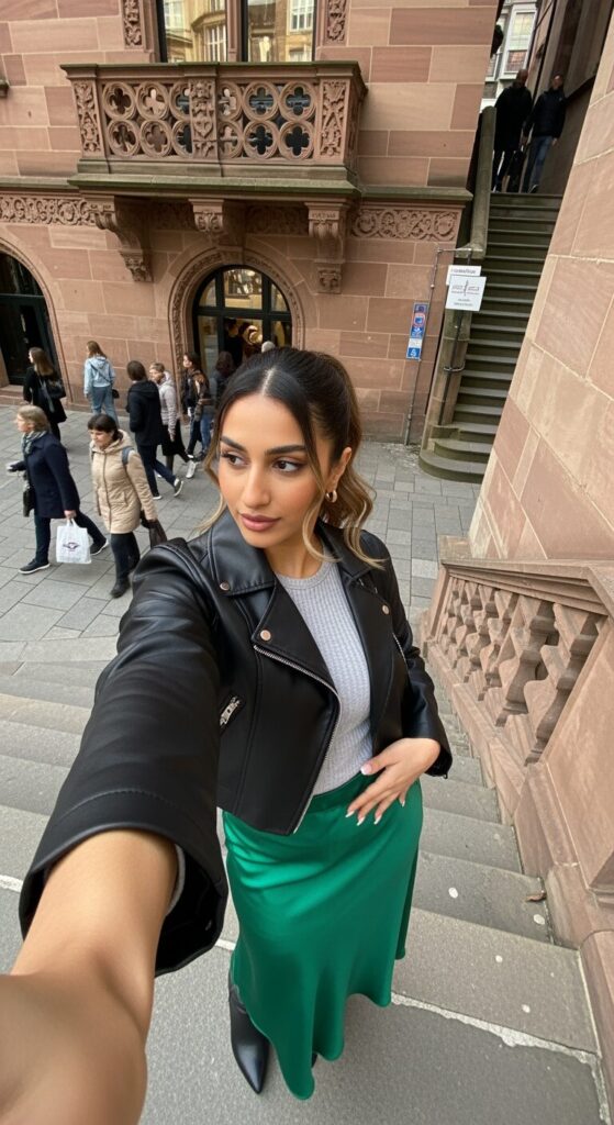 A leather jacket with a satin skirt creates an edgy yet feminine contrast.