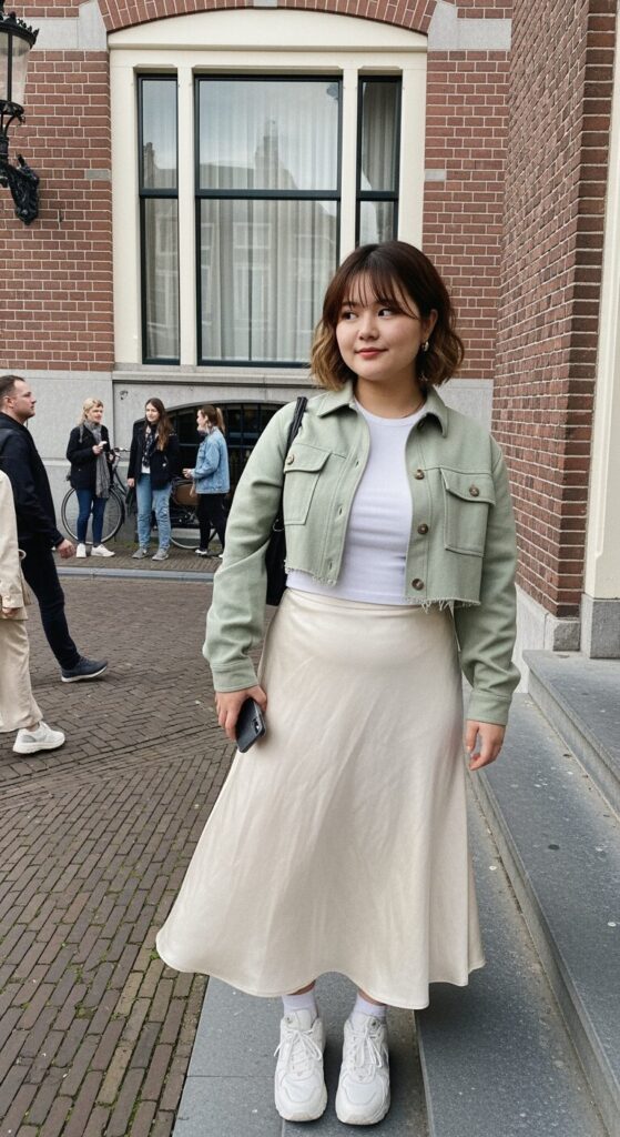 The cropped shacket adds structure, the tee keeps it chill, and the satin skirt pulls everything together.