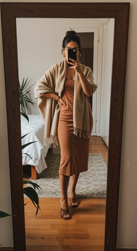 You can take a long scarf, drape it over your shoulders, and belt it at the waist to instantly create a flattering silhouette.