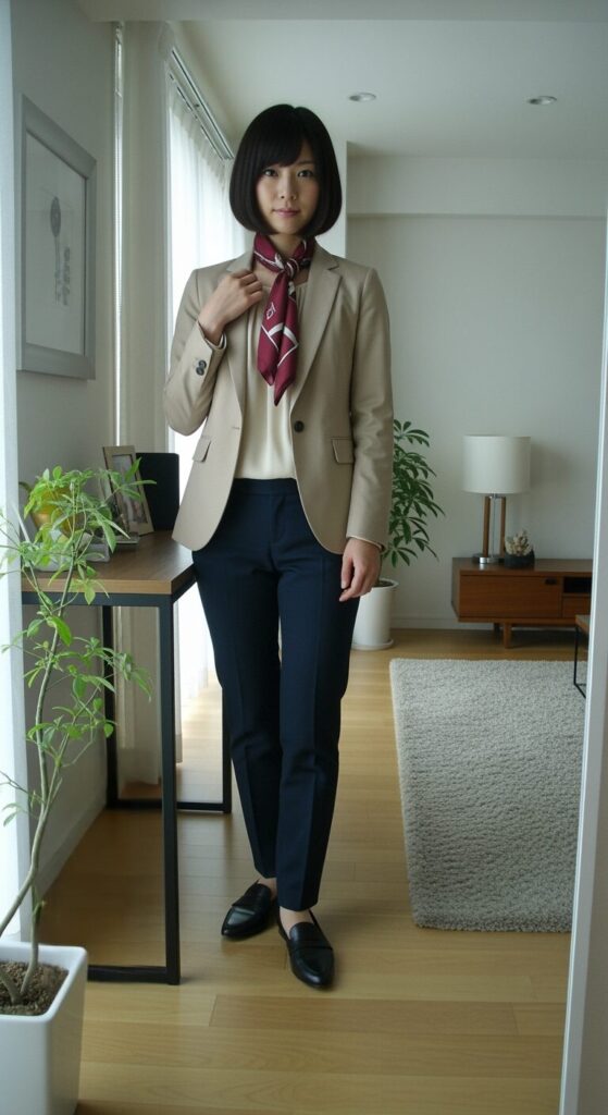 This one is a personal favorite because it is professional yet stylish. I like to knot a scarf neatly under my blazer collar, and suddenly my office outfit feels complete.