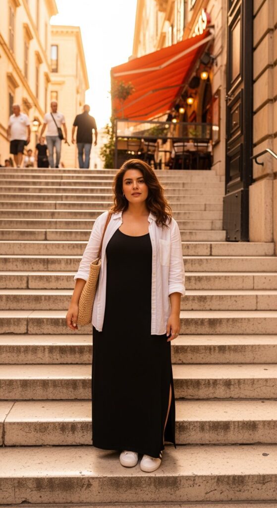 White Button-Down Over a Black Maxi Dress