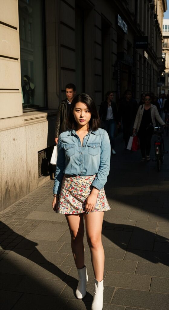 Honestly, the patterned skirt adds that playful pop while denim keeps it chill. You’ll feel like you own the street without trying too hard.
