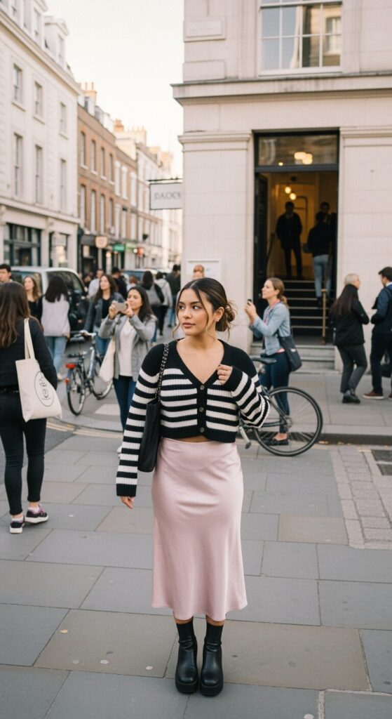 Ok, let’s talk vibes. Striped cardigan with a satin skirt equals soft but edgy combo.