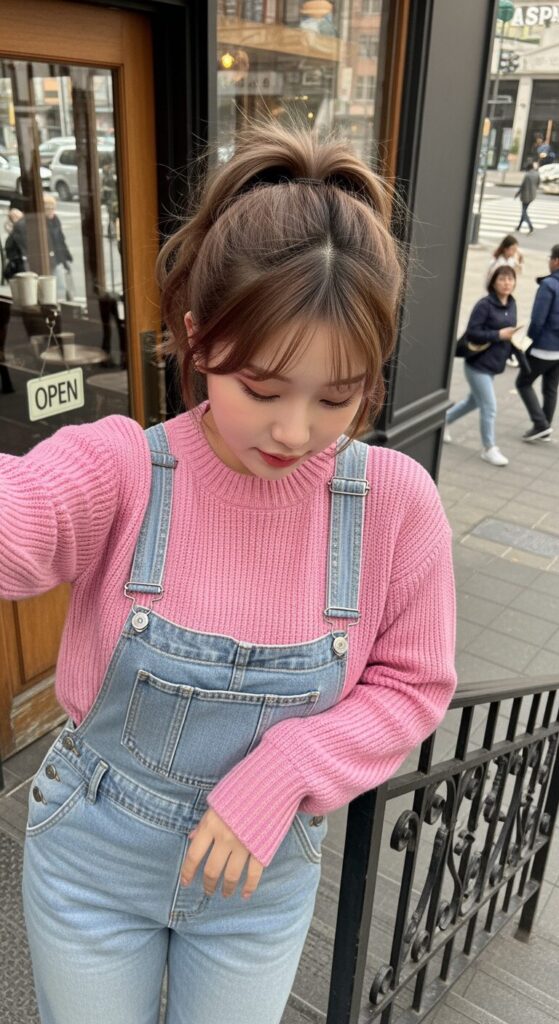 When I throw on a soft pink sweater under a denim dungaree, it gives this sweet, playful vibe that just feels fun.