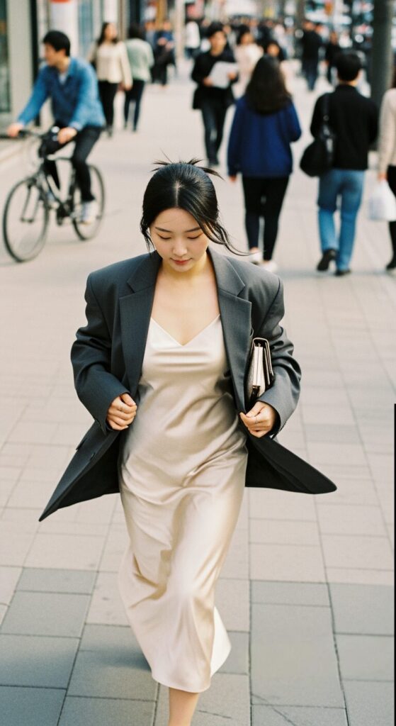 That satin texture catches the light beautifully and the blazer adds structure so the whole look feels elevated without trying too hard.