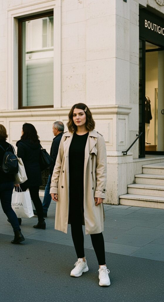 I love throwing on black leggings with a neutral top and a long trench coat because it instantly feels chic, effortless, and street-ready.