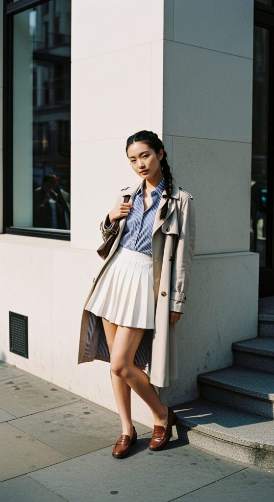 A striped button-down with a pleated tennis skirt under a trench gives youthful and fresh vibes.