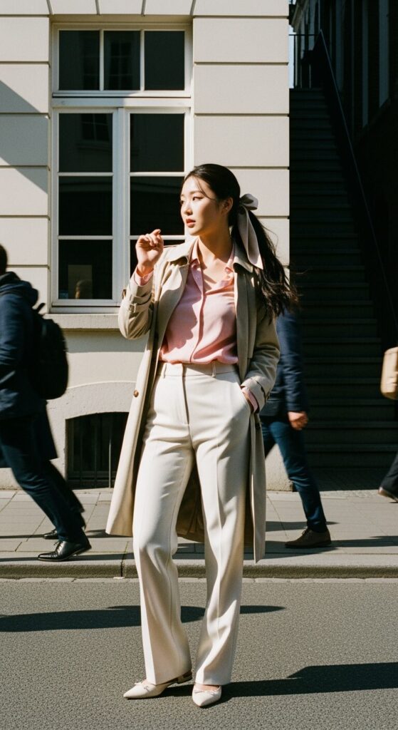 The pink button-up adds a playful pop under a beige trench, while the wide-leg pants keep it chic and polished.