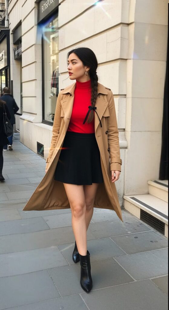 Red under a trench is loud but classy. Black skirt keeps it grounded.