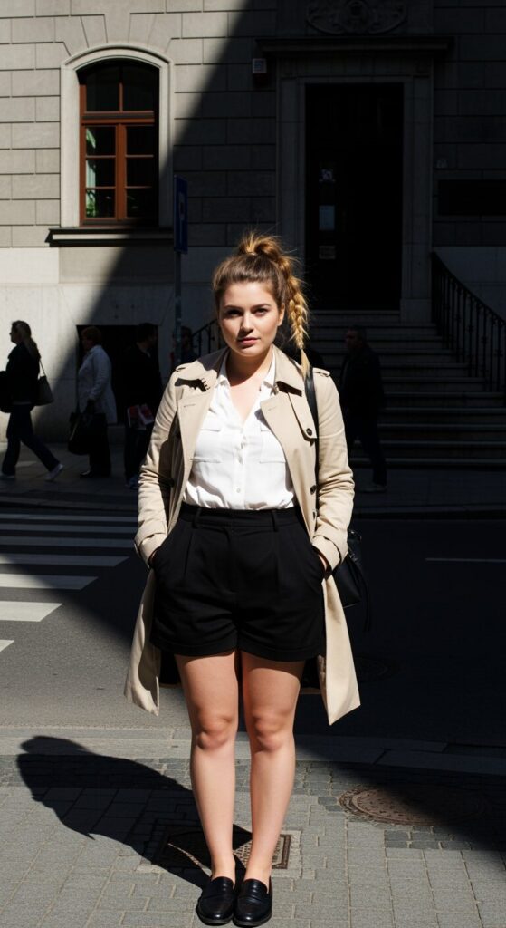 White Button Down + Black Shorts + Beige Trench Coat
