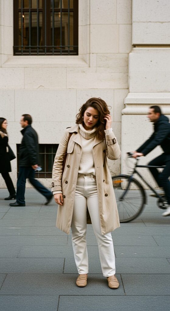 A cream turtleneck with white denim under a trench feels clean, cozy, and polished all at once.