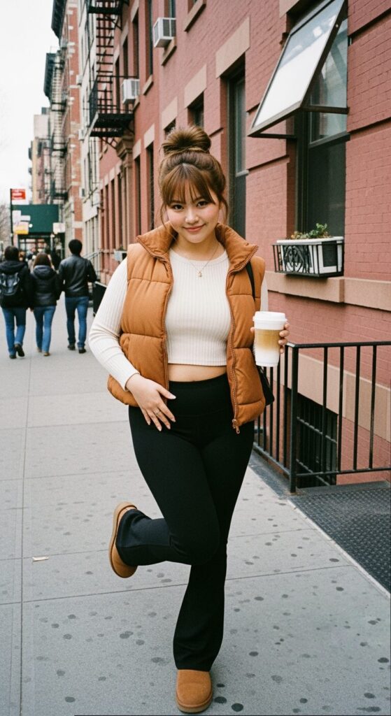 The brown puffer vest gives cozy energy but like cute cozy. You know? Not sloppy.