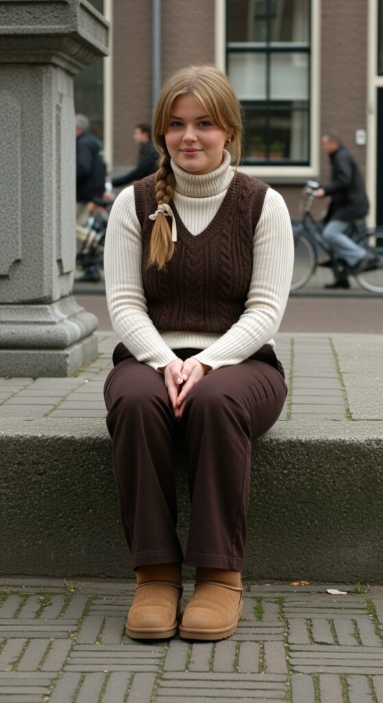 The sweater vest sitting over the turtleneck gives academic but cute vibes. The pants make it clean.