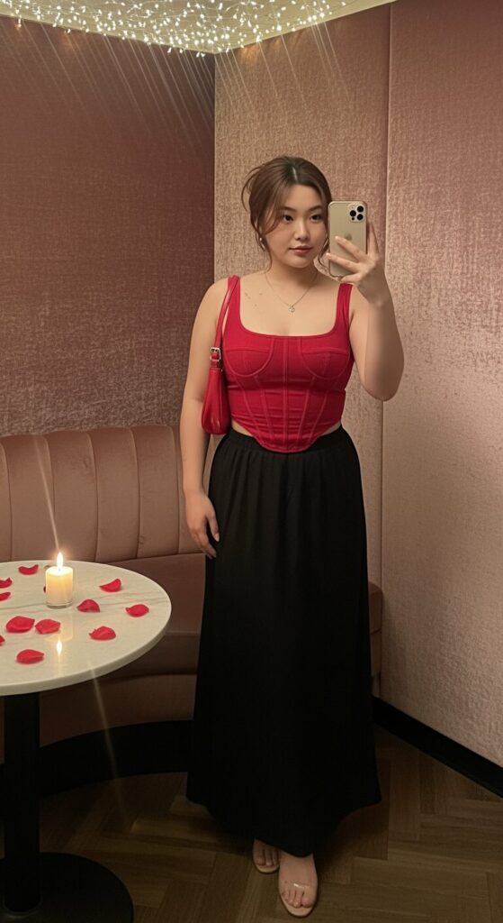 Okay, this red corset crop tank top with a black maxi skirt is giving me classic sexy Valentine’s energy.