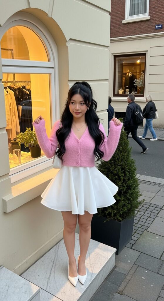 Omg babes, this pink patterned fluffy cropped sweater with white pants is pure cozy-cute Valentine’s energy. I love how it’s soft, flirty, and stylish all at once.