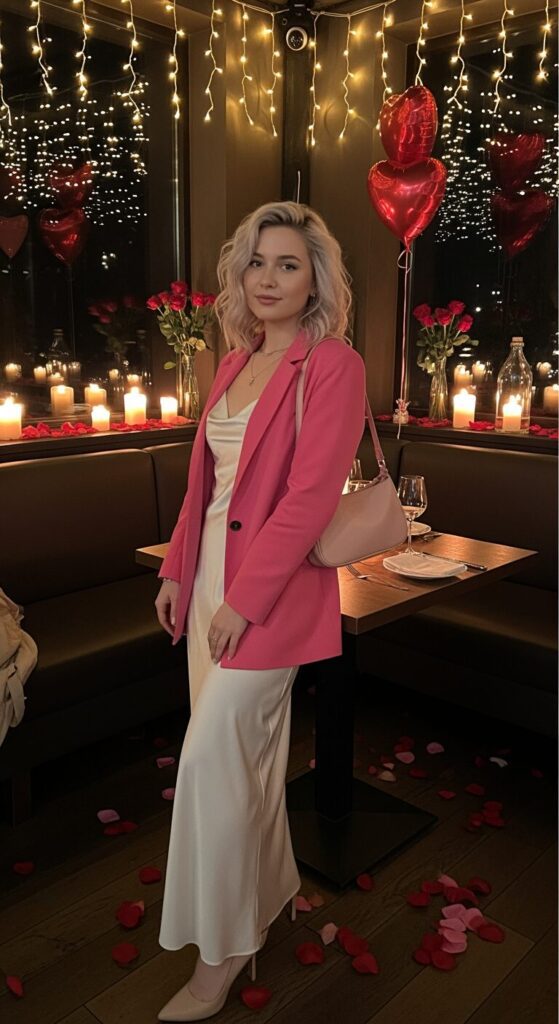 This pink blazer over white satin maxi dress is literally boss babe meets romantic Valentine’s vibes.