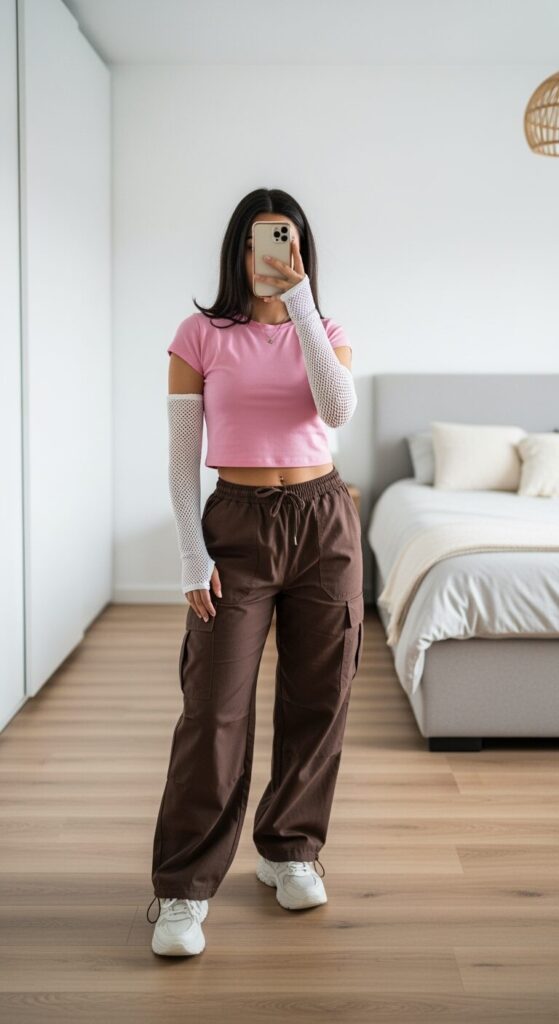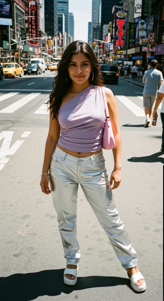 You can throw on a pair of parachute pants with a cropped top and instantly feel like you’re starring in a music video. Or pair a metallic crop top with flared jeans and look like you just stepped out of a 2004 pop concert.